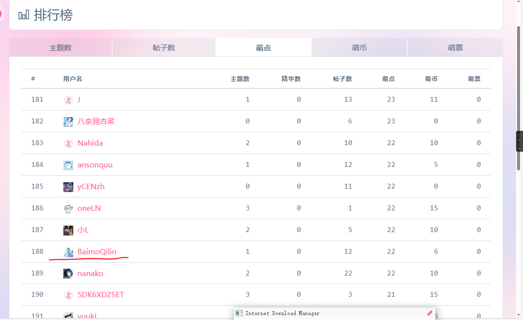 萌社区活跃成员(例如萌点排行榜前200名)