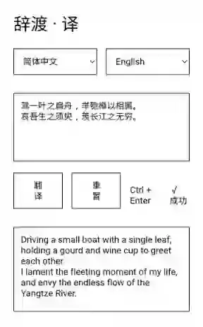 Ctrl + Enter 双键齐按,译文即现。界面素白,无画蛇添足之饰,唯留“辞渡”二字悬于顶上,若古渡茶幡,待君来泊。