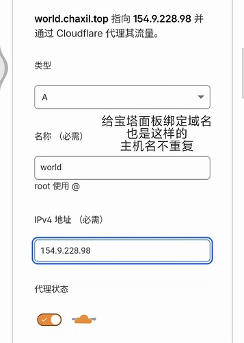 在Cloudflare添加A解析,主机名随意,记录值填服务器IP,开启小黄云(Proxied)。通过新域名登录面板后,常用设置→绑定域名,禁止IP访问面板