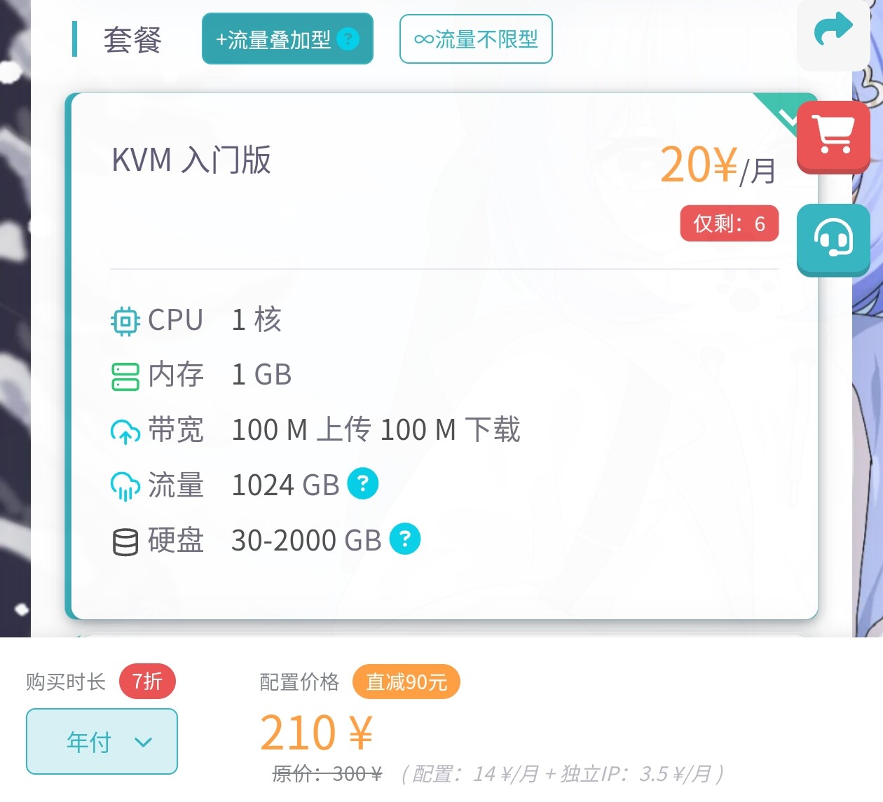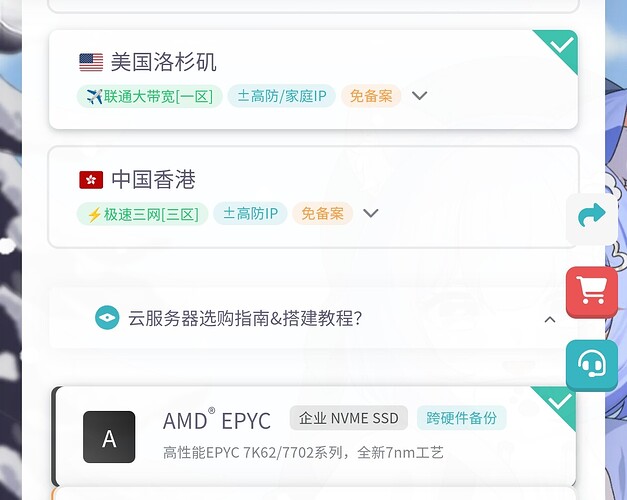 总览→云服务器→购买云服务器。区域选择美国洛杉矶(联通大带宽[一区]),配置选AMD EPYC KVM入门版(1核1G),系统选择自带宝塔面板的Debian 10,购买时长一年,完成支付