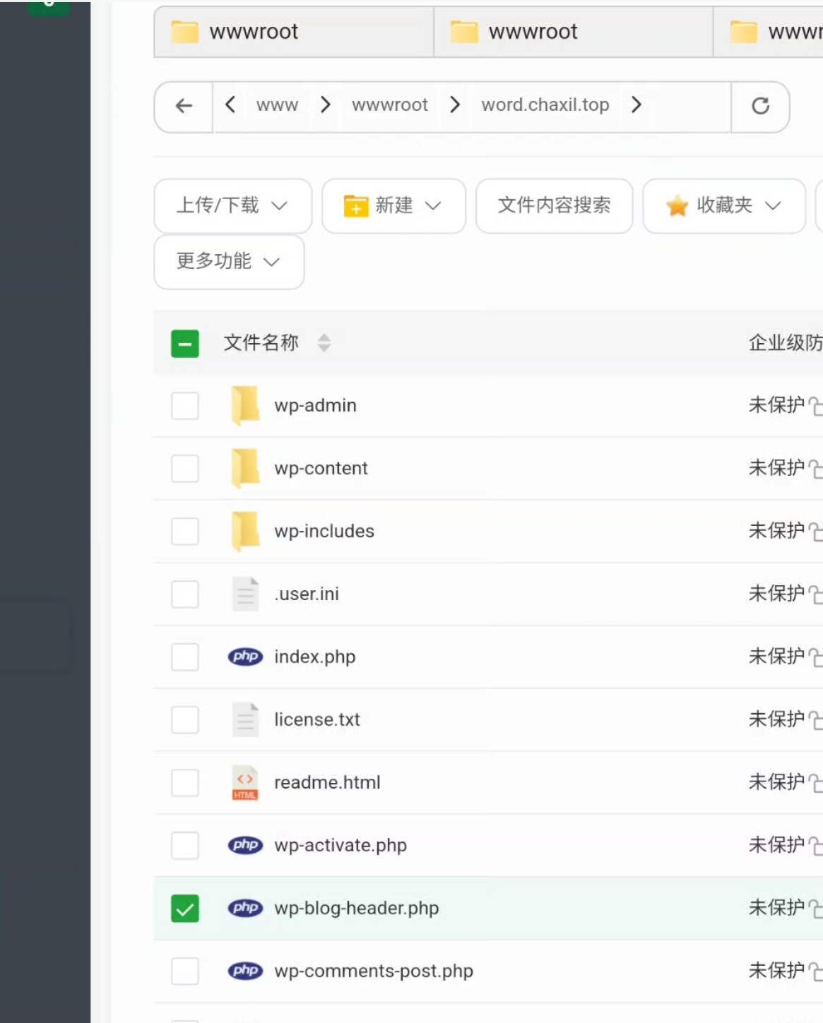 进入网站根目录,删除所有默认文件。打开wordpress.org下载最新版,返回面板上传源码、解压、移动到根目录