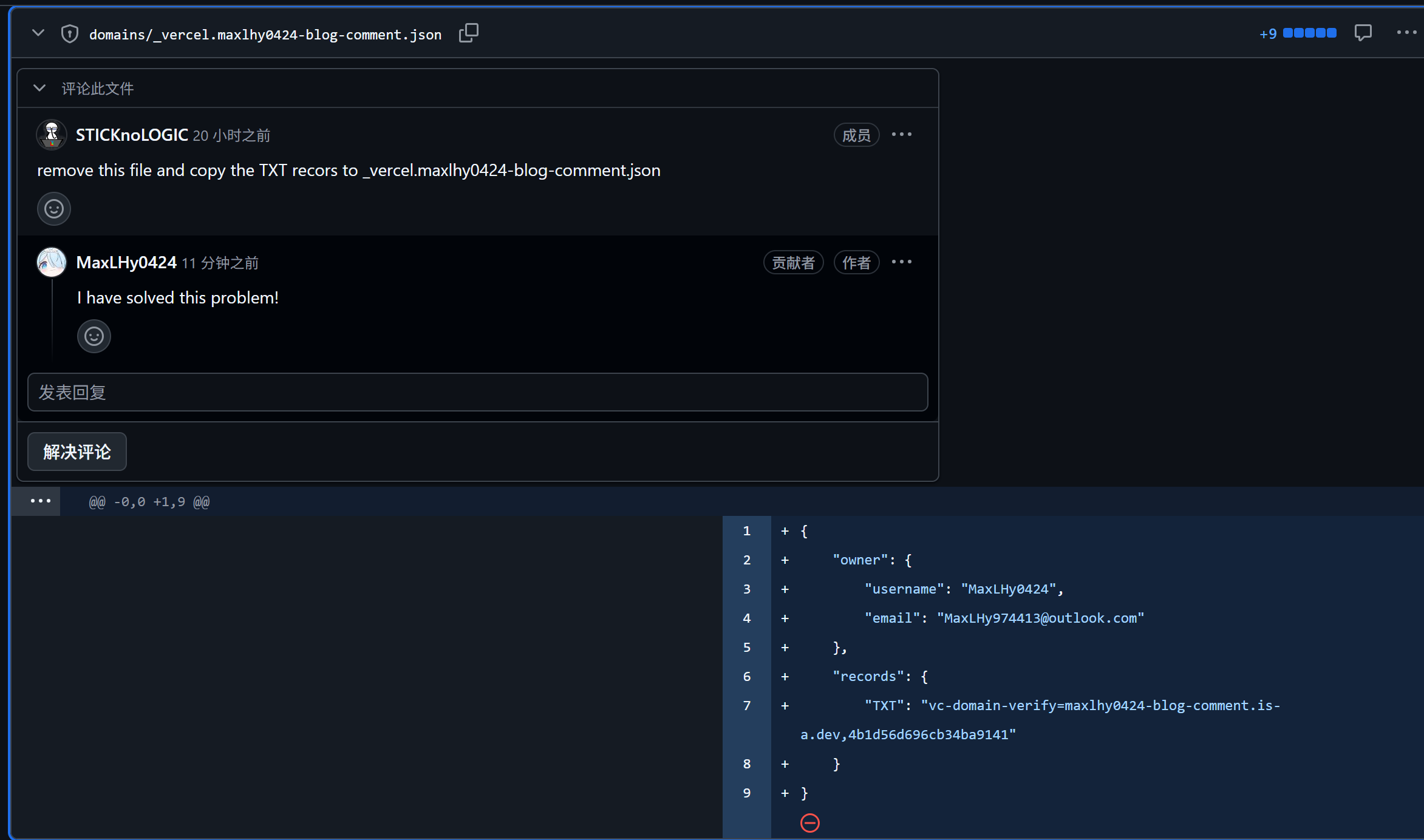 GitHub评论STICKnoLOGIC: “你应该删除这个文件,把TXT记录复制给_vercel.maxlhy0424-blog-comment.json。”MaxLHy0424: “问题已经解决了。”(然而这已经太迟了)