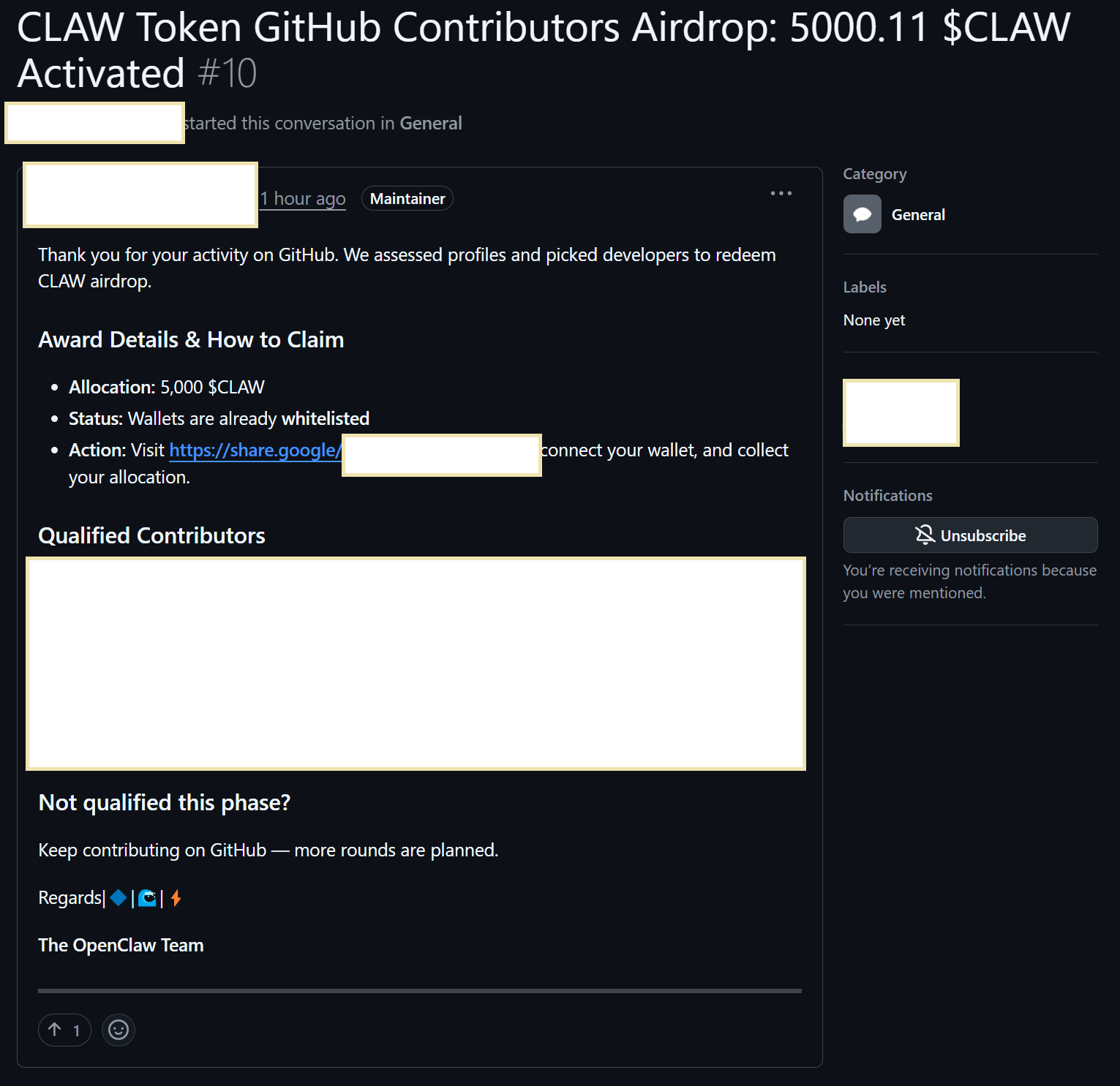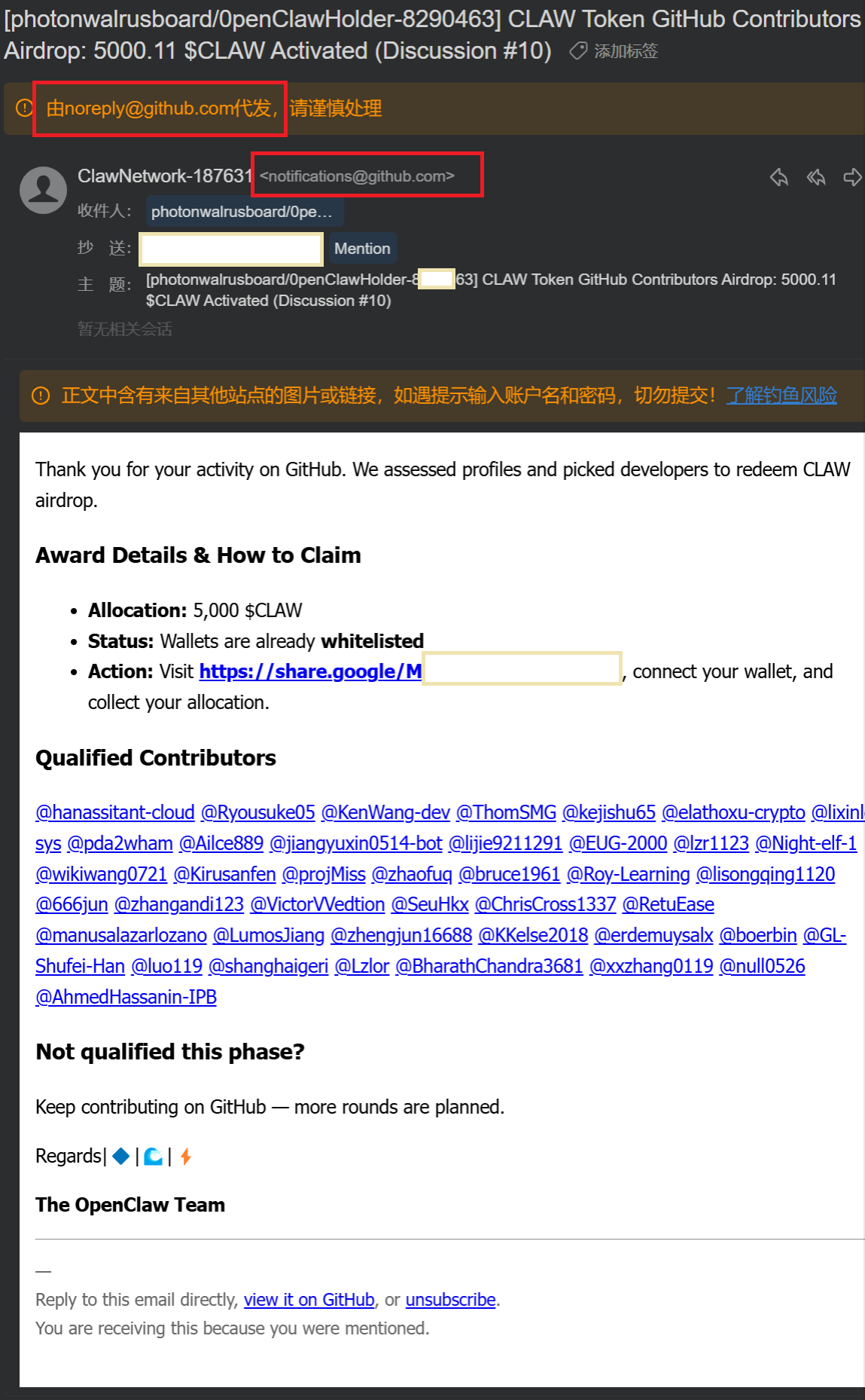 最近发现了有骗子以“openclaw空投计划“为理由,在新的、非官方的GitHub仓库并在discussion @你,号称为感谢对社区的贡献而发放奖励喵